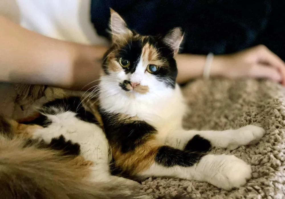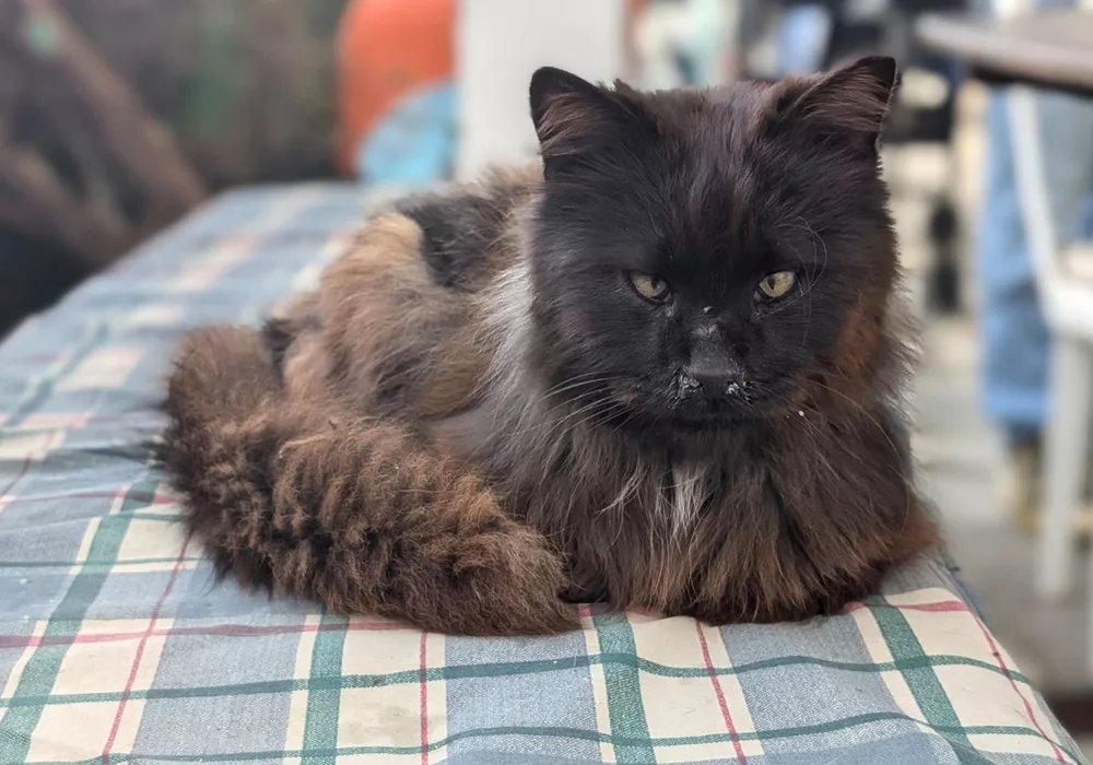 Our long-haired calico Splash came into our care as a young kitten in 2024. She had been attacked by a dog and suffered an injury to her eye which has left a permanent mark. The attack also left her with a hernia for which she had successful surgery. After a long wait, this delightful young lady has at last travelled to her new home in Sweden which she will share with two former Syros Cats, Abbe and Ronje. She has settled well and already looks so chilled and at home.