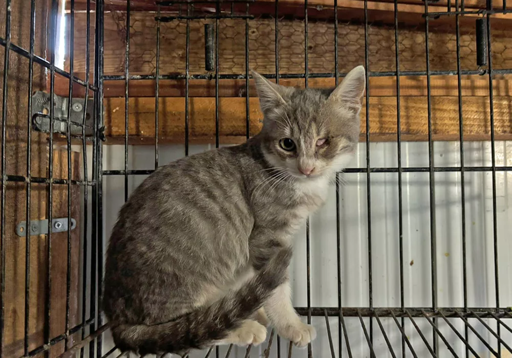 Like Luke, grey-and-white Luna was also sickly, dirty and infested with parasites when she arrived. She has also lost one eye, we assume due to an early infection as a young kitten – again a very common occurrence when kittens are born to sickly mothers. She too is given food supplements each day, but so far has avoided the indignity of regular baths and treatment with anti-fungal spray! We’re delighted to say that she is also gaining weight – always a good sign! At the moment, she is friendly and sweet but quite nervous and dislikes being held, but we’re hopeful this will change.